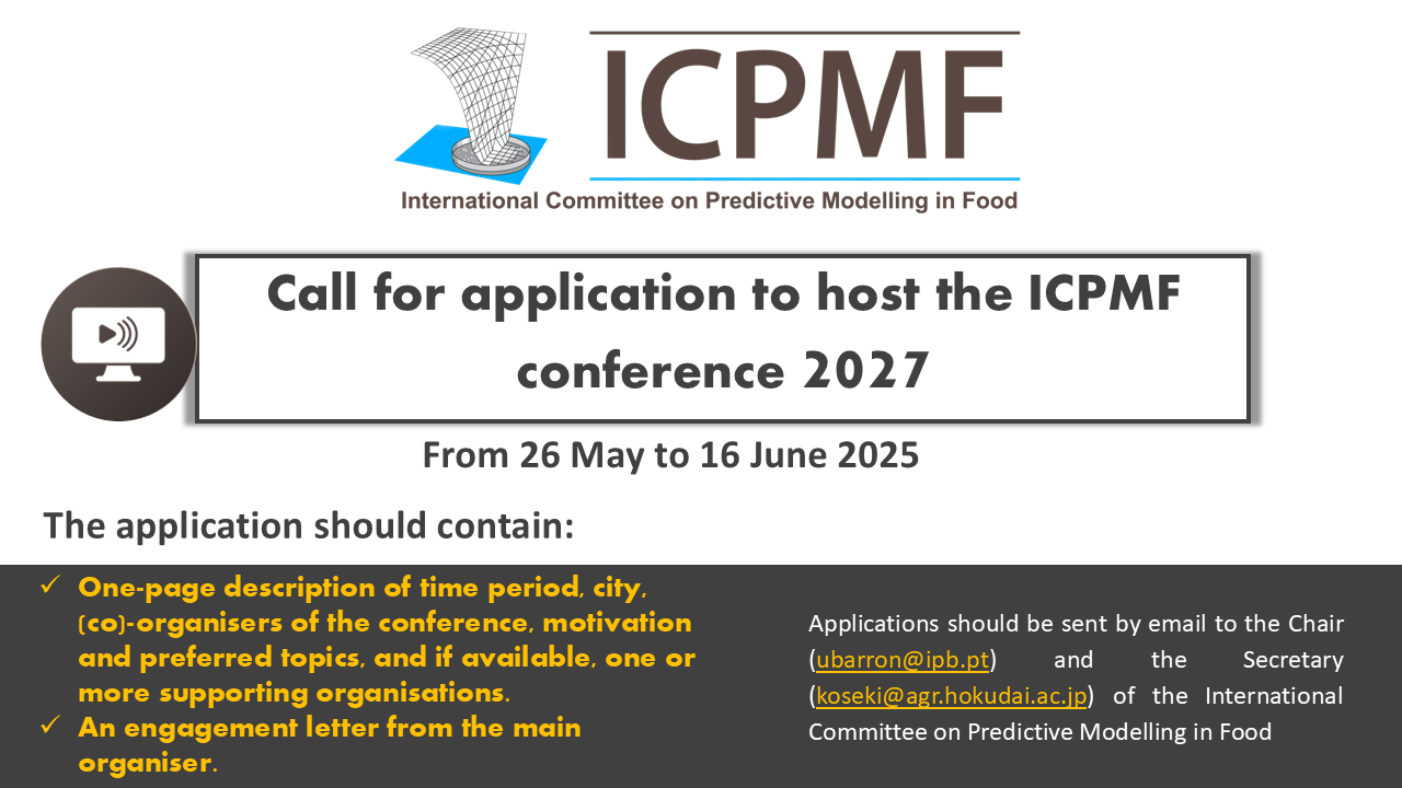 The ICPMF member will be elected by vote for a 10-year term, for which a majority vote of all ICPMF current committee members will be required. Candidates should submit an expression of interest and a maximum of two letters of support by e-mail to the ICPMF Chair (koseki@agr.hokudai.ac.jp) and secretary (george.nychas@gmail.com), no later than 31 January 2026. The expression of interest should include the relevant achievements of the candidate in the field of Predictive Modelling in Food, motivation, the expected contribution to ICPMF activities, and other significant aspects related to the ICPMF mission and vision.